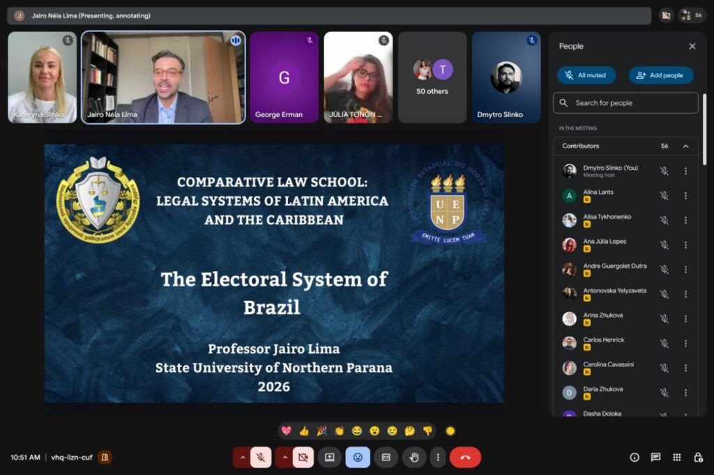 🔷 Після офіційного відкриття професор Державного університету Північної Парани (UENP, Бразилія) Жайро Нейя Ліма провів першу лекцію на тему «Виборча система Бразилії». Тема викликала значний інтерес у слухачів: лекція супроводжувалася жвавим обговоренням та студенти активно ставили запитання та долучалися до фахової дискусії.