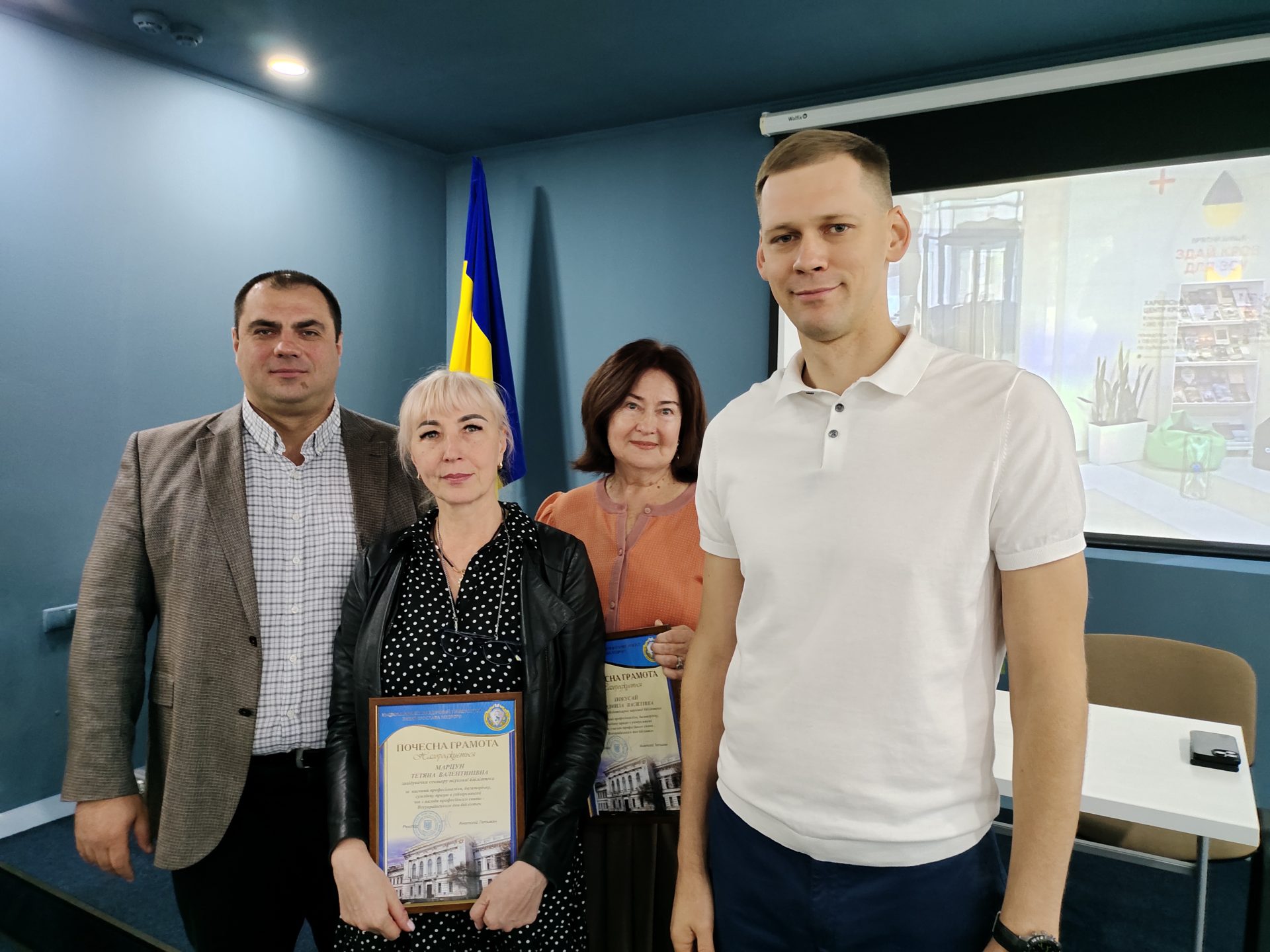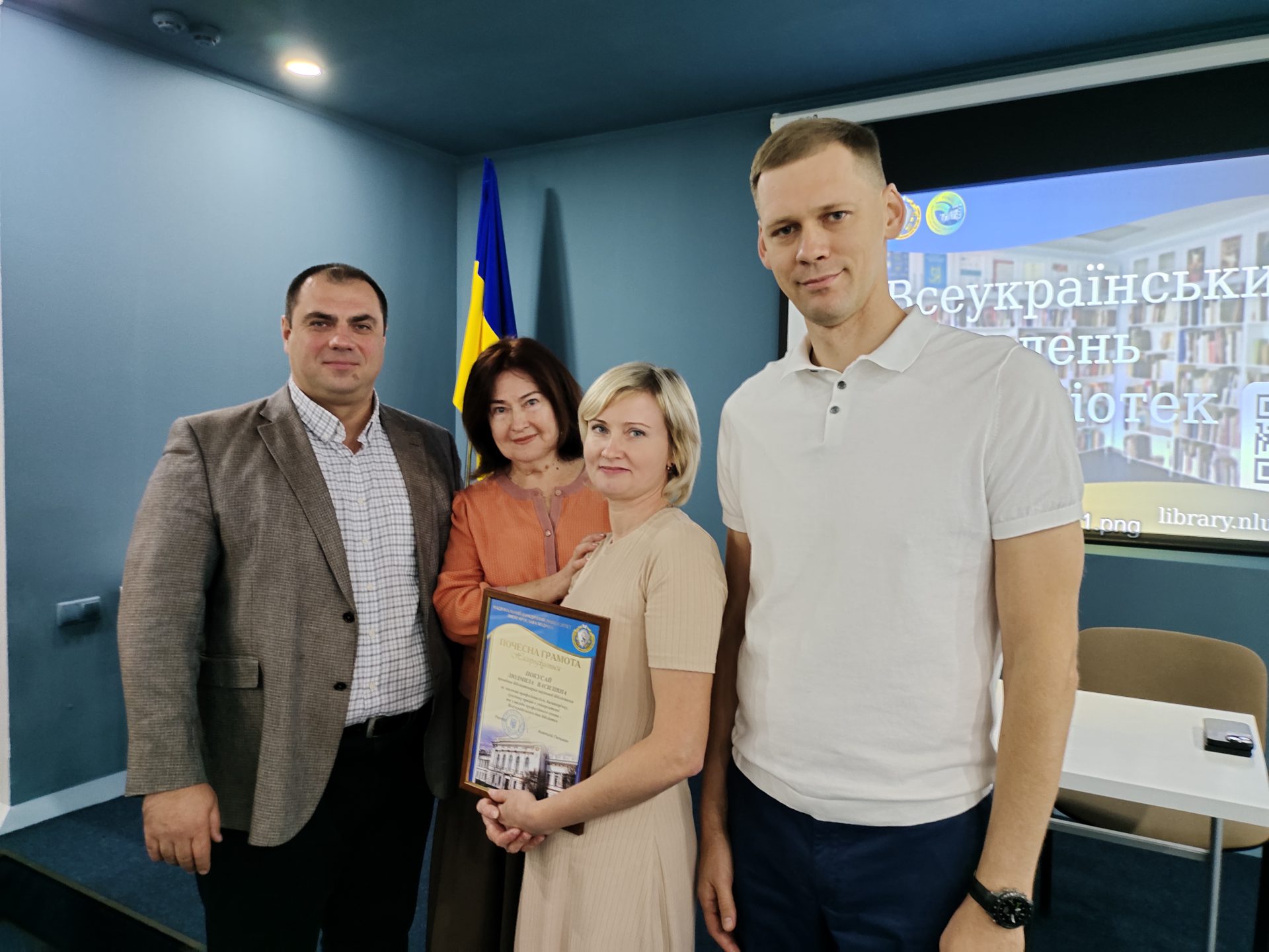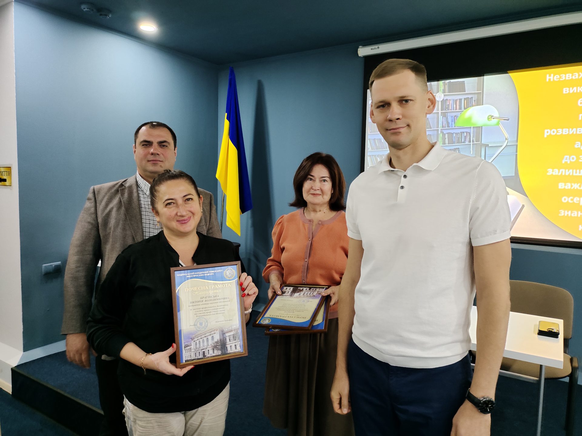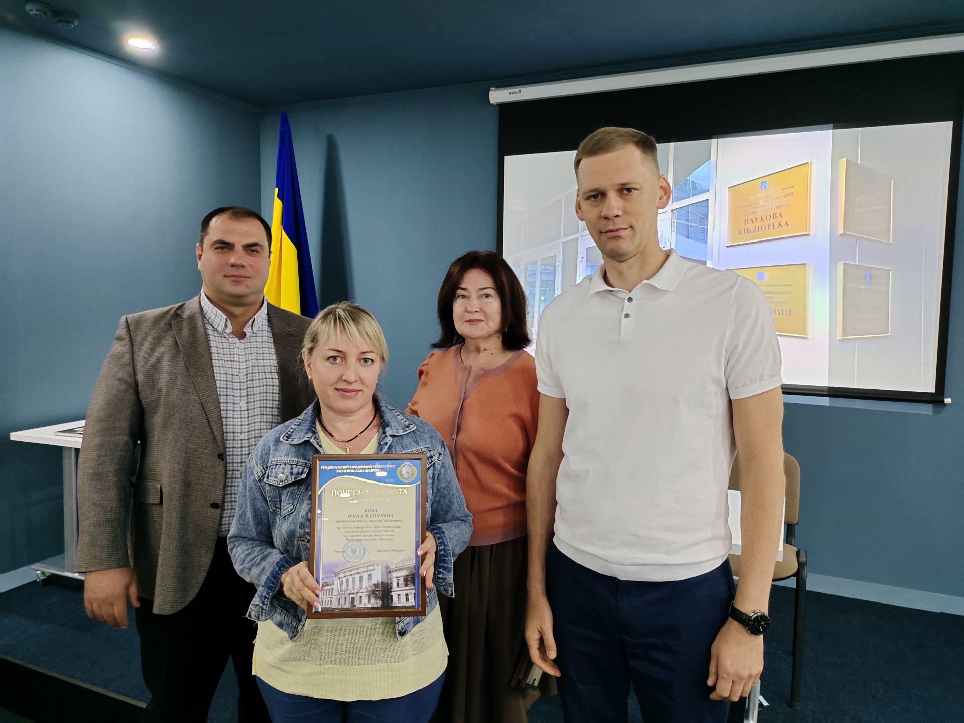 У межах заходів, присвячених Всеукраїнському дню бібліотек у Навчально-бібліотечному комплексі Національного юридичного університету імені Ярослава Мудрого відбулися зустрічі студентської молоді та співробітників Наукової бібліотеки з проректором з навчально-виховної роботи та соціального розвитку, доктором філософії Олексієм Нестеровичем. Він від імені ректорату університету привітав колектив бібліотеки та вручив почесні грамоти Бові Ірині, Брагінській Вікторії, Покусай Людмилі, Марцун Тетяні за високий професіоналізм, багаторічну, сумлінну працю та з нагоди професійного свята.