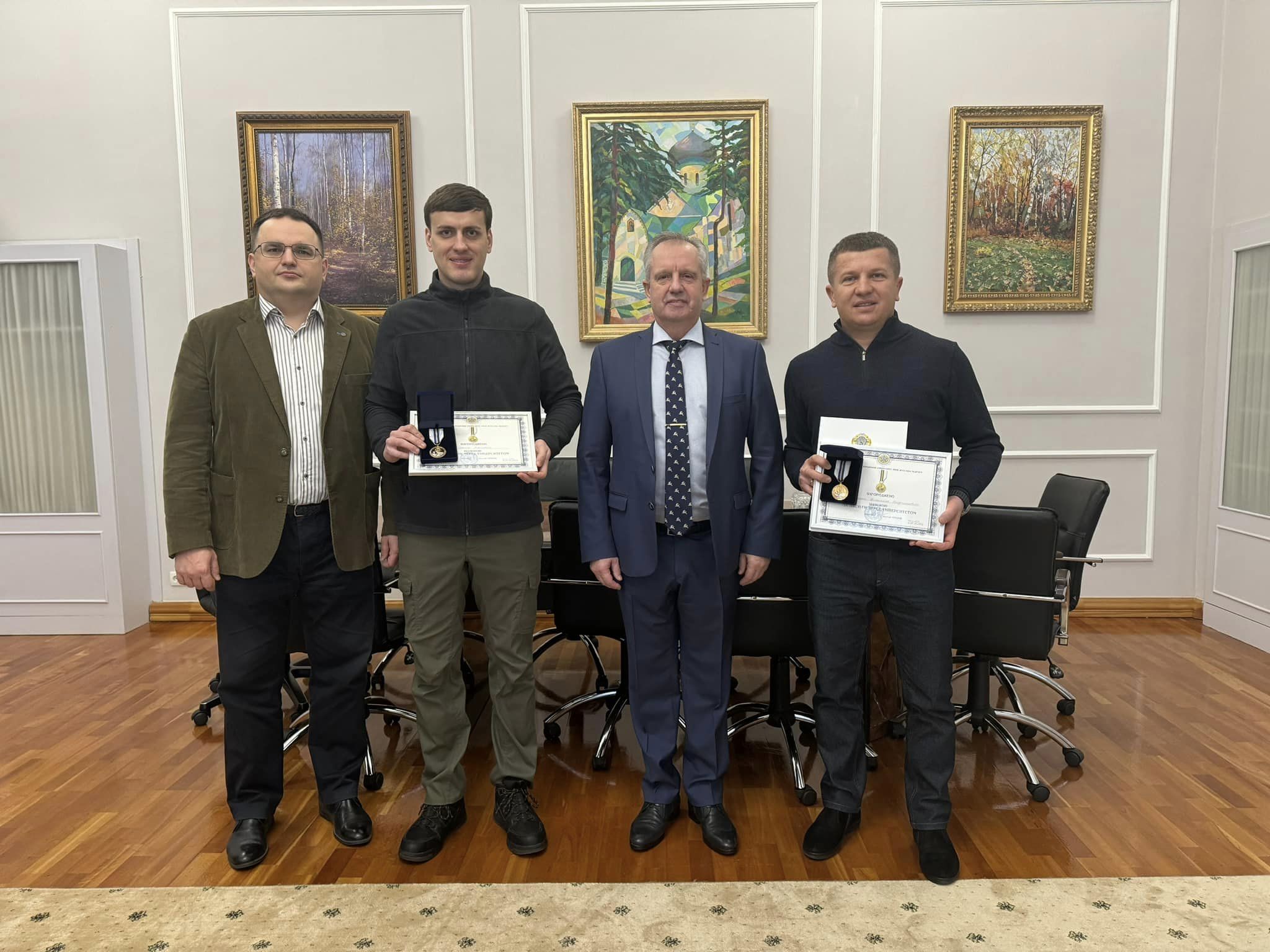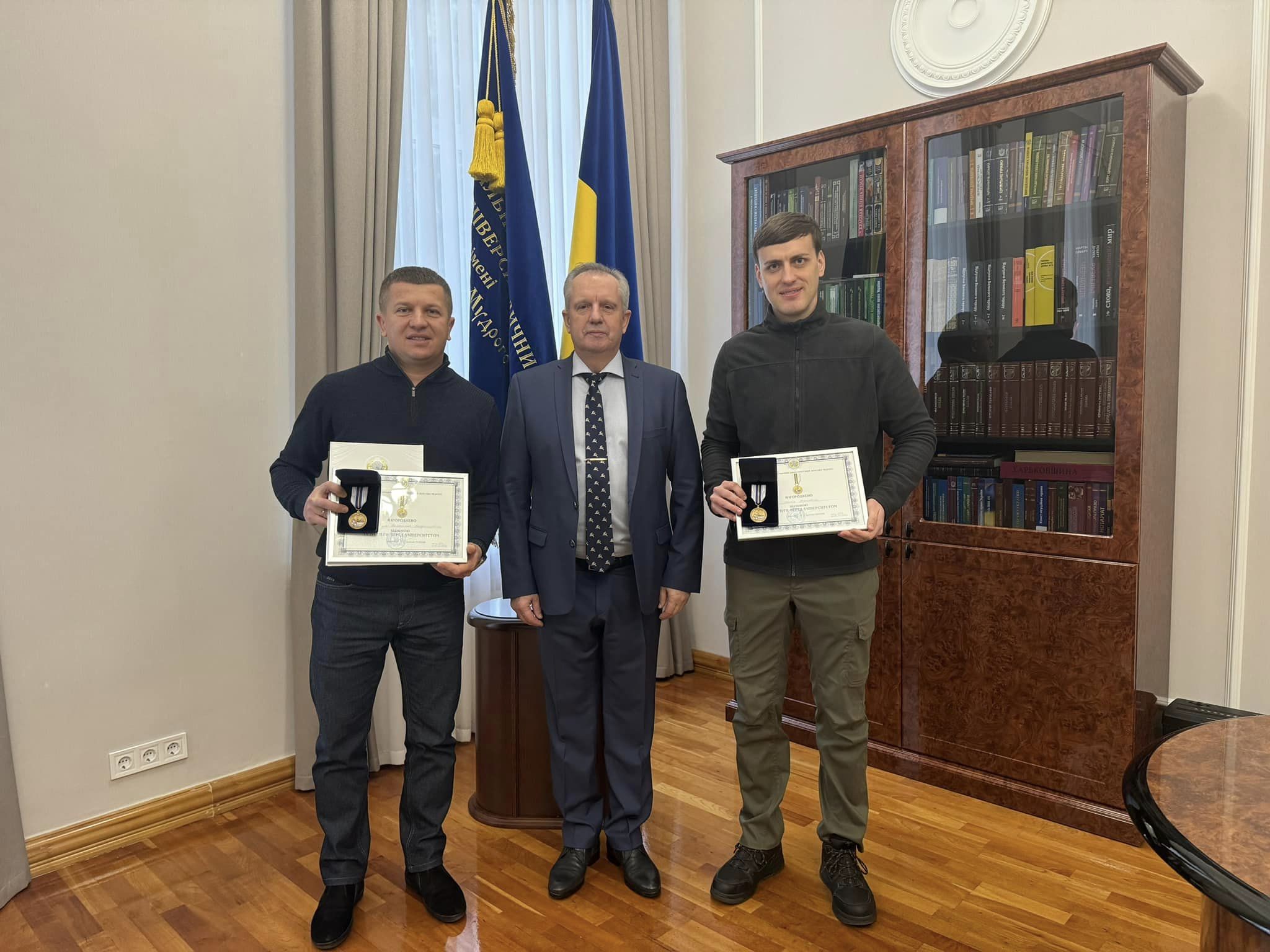 Ректора Університету Анатолій Гетьман та проректор з науково-педагогічної роботи та стратегічного розвитку Юрій Барабаш волонтерам та випускникам Університету Валентину Мельнику та Олексію Курцеву вручили відзнаки «За заслуги перед Університетом».