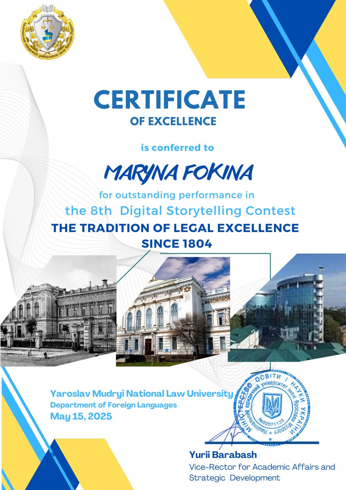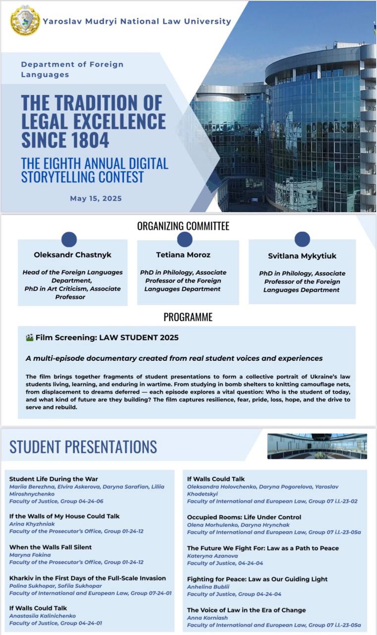 15 травня 2025 року у день вишиванки відбувся восьмий щорічний конкурс цифрових історій «The Tradition of Legal Excellence since 1804», який уже став яскравою академічною традицією. Цьогоріч захід знову об’єднав студентів і викладачів, які прагнуть не лише до фахової досконалості, а й до глибокого осмислення реалій сучасної України через особисті історії, правові цінності й громадянську свідомість.