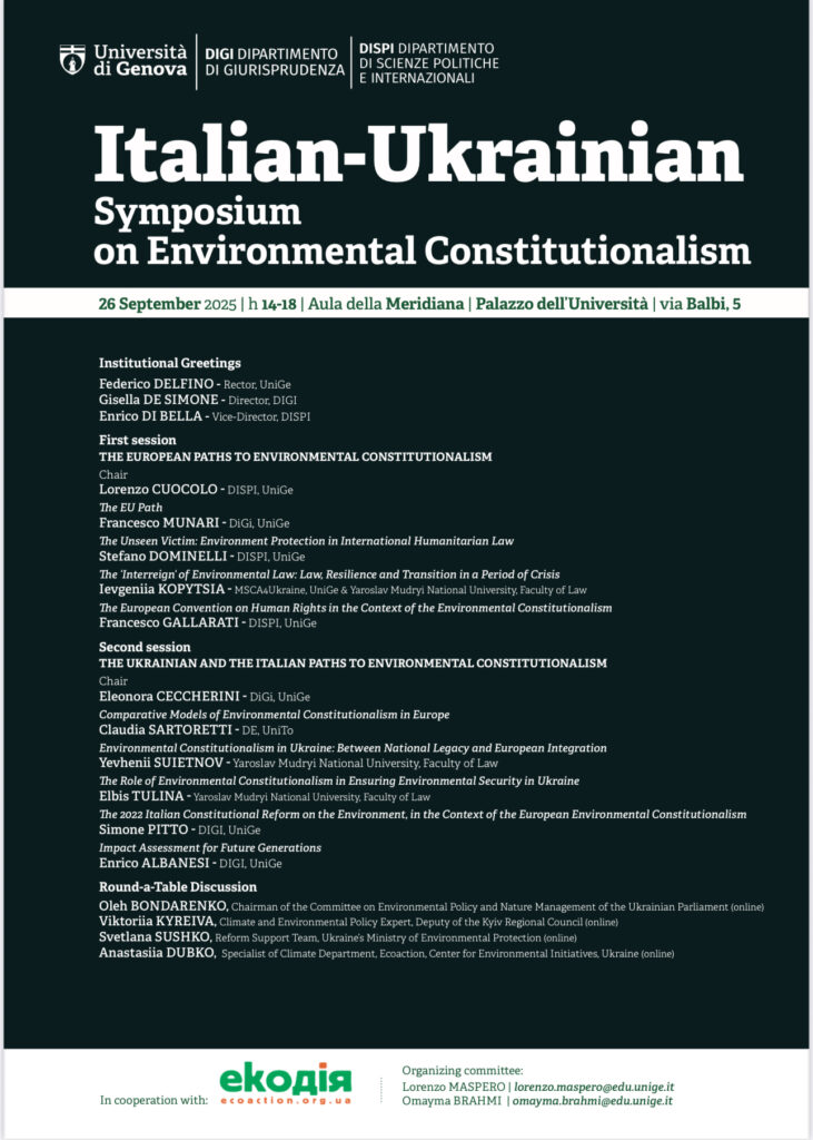 26 вересня 2025 року завідувач кафедри екологічного права Національного юридичного університету імені Ярослава Мудрого Суєтнов Євгеній Павлович, та доцентки Туліна Ельбіс Євгенівна та Копиця Євгенія Миколаївна взяли участь у Міжнародному італійсько-українському симпозіумі з екологічного конституціоналізму (Italian-Ukrainian Symposium on Environmental Constitutionalism), який відбувся в Університеті Генуї (Італія).