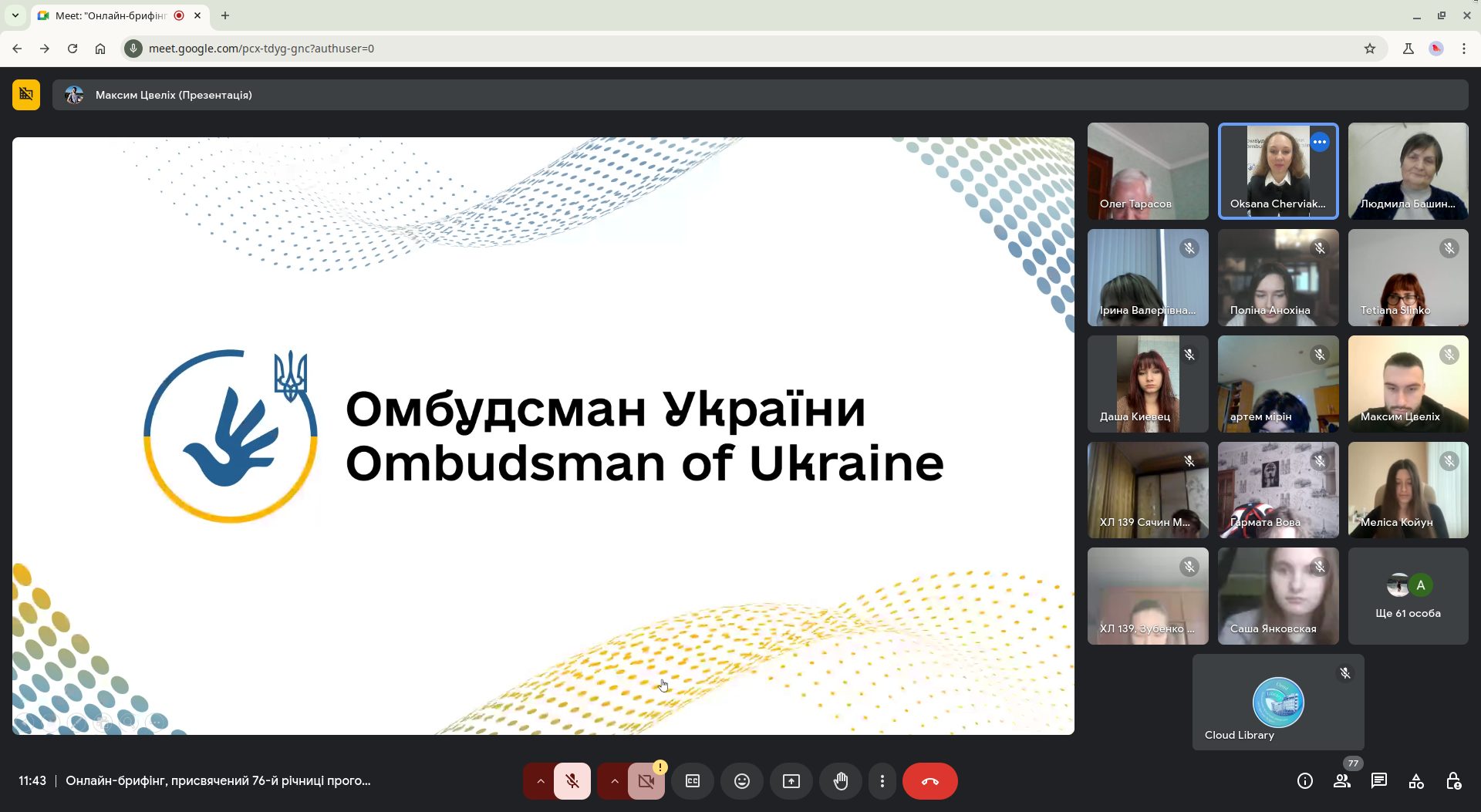 Представник Уповноваженого Верховної Ради України з прав людини у Харківській області, к.ю.н., доцентка кафедри міжнародного права Оксана Червякова у своїй доповіді «Омбудсман України» акцентувала увагу на нових викликах, які постали у сфері захисту прав та свобод людини після повномасштабного вторгнення росії на територію України. Доповідачка розповіла про діяльність Офісу Омбудсмана та висвітлила питання захисту прав осіб, які постраждали внаслідок збройної агресії росії проти України.