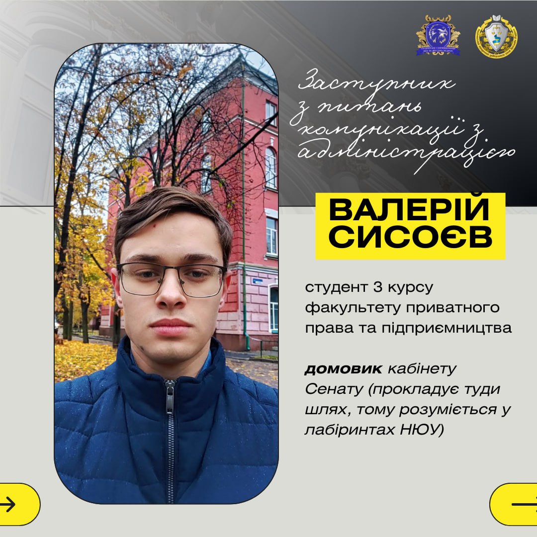 З питань комунікації з адміністрацією – Валерій Сисоєв, студент 3 курсу факультету приватного права та підприємництва