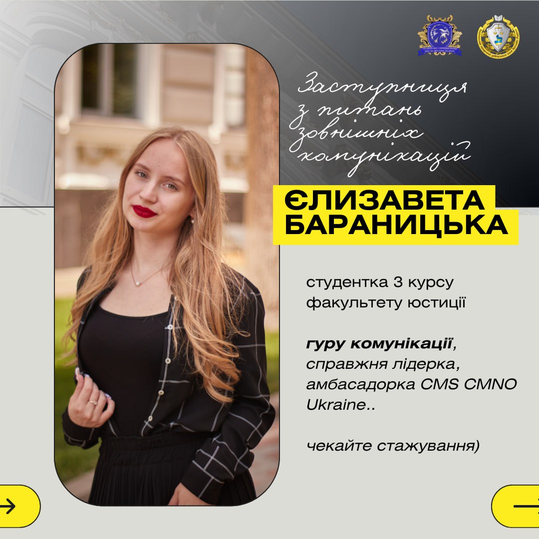 З питань зовнішніх комунікацій – Єлизавета Бараницька, студентка 3 курсу факультету юстиції