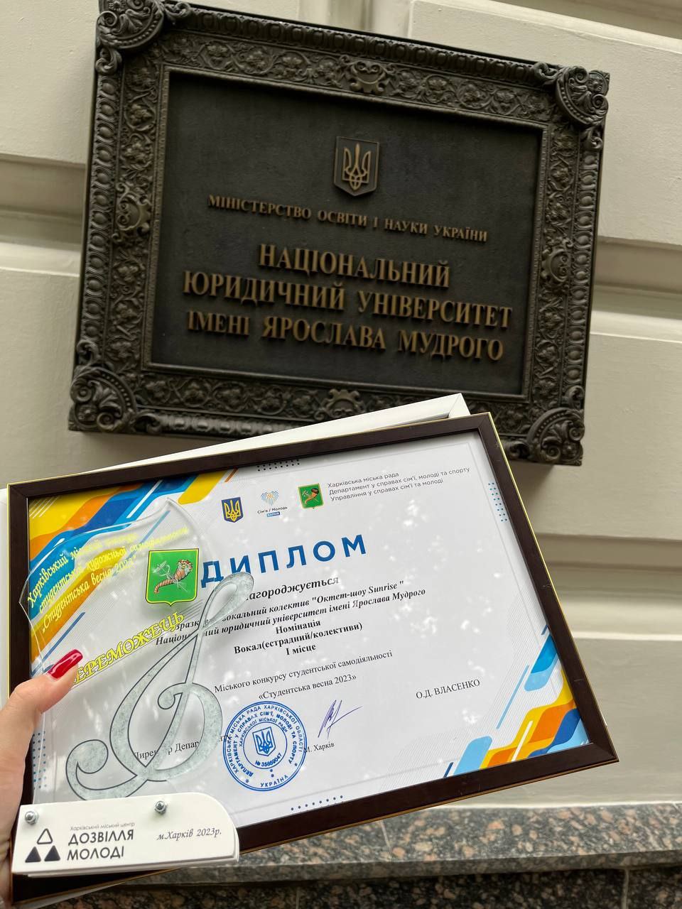 Зразковий колектив «Октет-шоу Sunrise» Національного юридичного університету імені Ярослава Мудрого у складі Лаптєвої Ірини, Більченко Анастасії, Івченко Анастасії, Петракової Олександри та Тарабріної Марії під керівництвом Харченко Вероніки стали переможцями Міського конкурсу студентської самодіяльності «Студентська весна 2023» в номінації «Вокал(естрадний/колективи)».