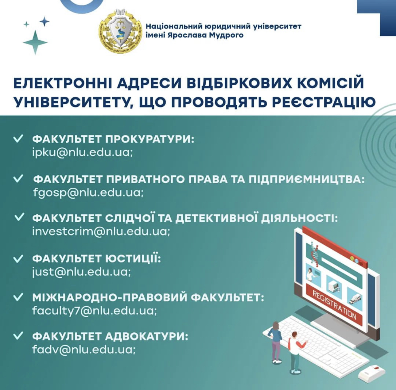 У даній статті можете ознайомитися з документами, які необхідно надіслати до приймальної комісії та електронними адресами відбіркових комісій Університету, що проводять реєстрацію.